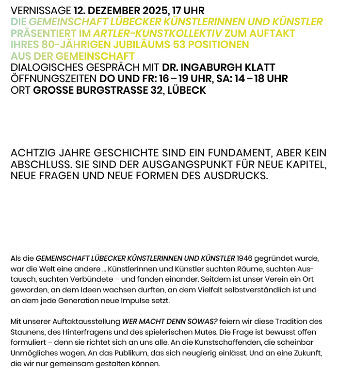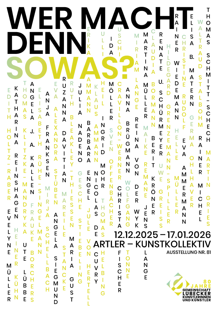 Die Gemeinschaft Lübecker Künstlerinnen und Künstler präsentiert im Artler-Kunstkollektiv ihres 80-jährigen Jubiläums 53 Positionen aus der Gemeinschaft